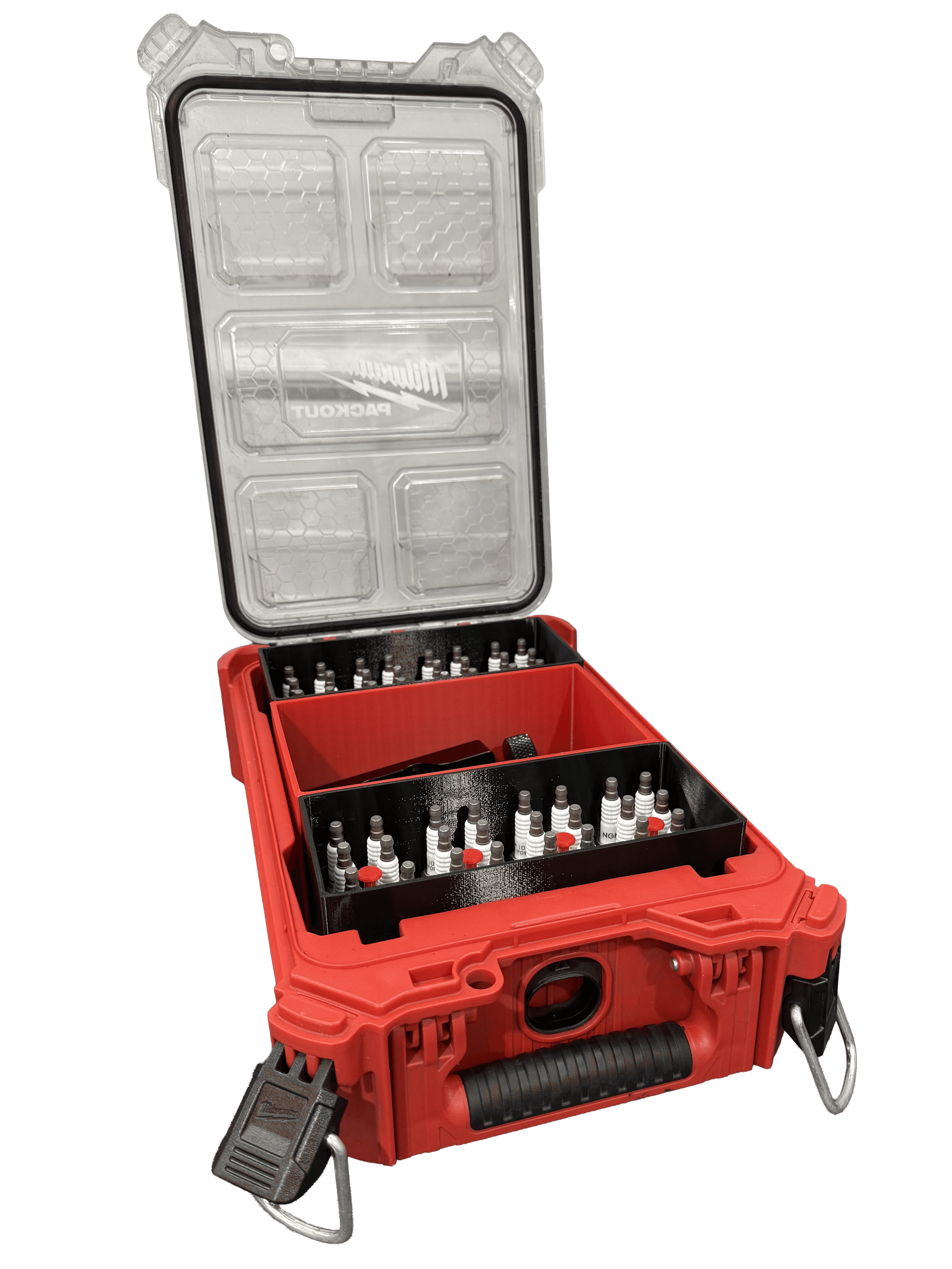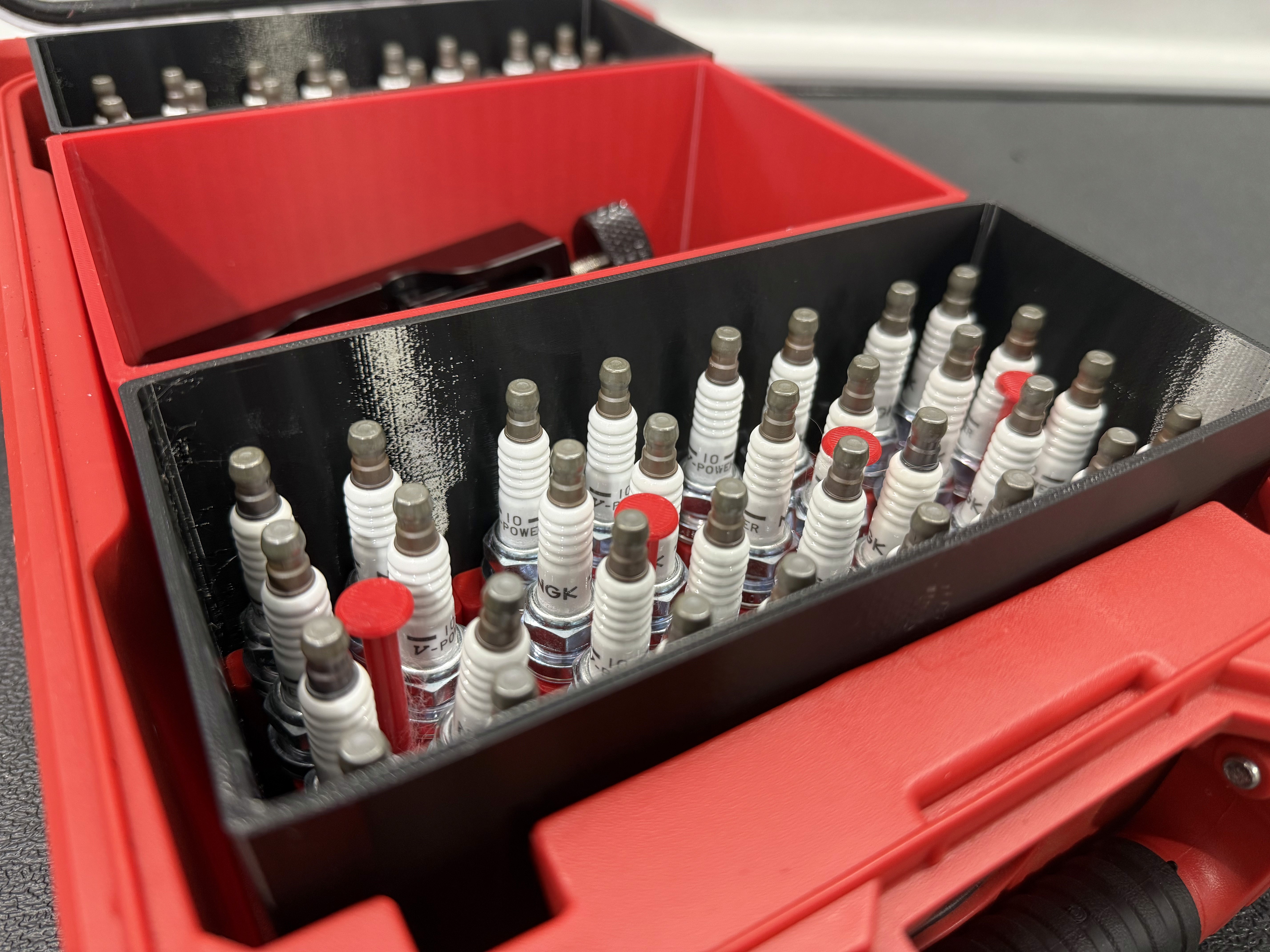 For the prepared bunch that doesn’t like to be spur-of-the-moment finding, gapping, and organizing spark plugs, we designed and printed up this organizer for a Milwaukee Packout.