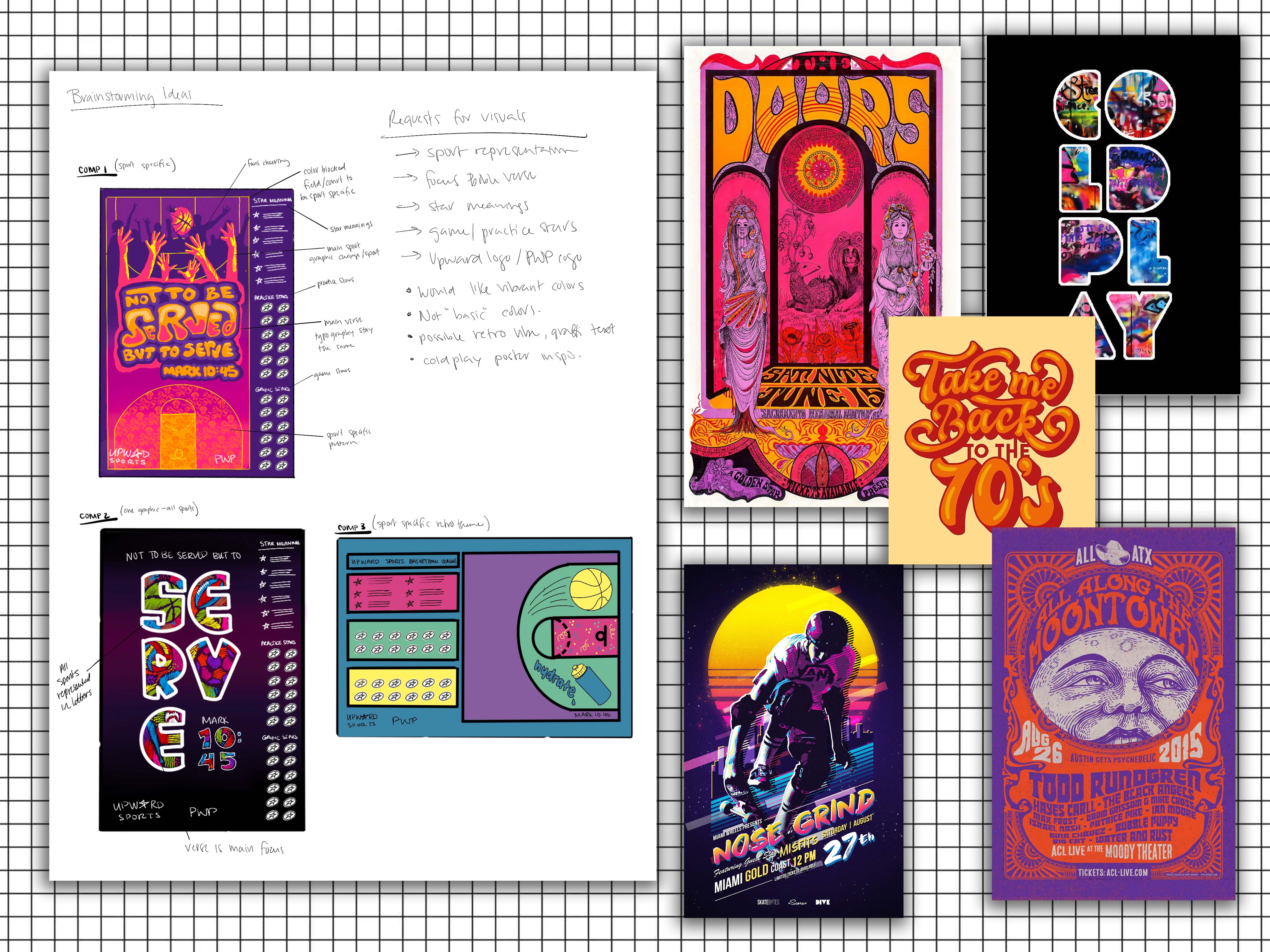 Ultimately we landed on the first comp that features fun groovy typography featuring the theme verse for the year, along with hand-drawn sport specific graphics that highlight each sport without focusing on a specific person, and a fun sport specific pattern at the base of each court/field.